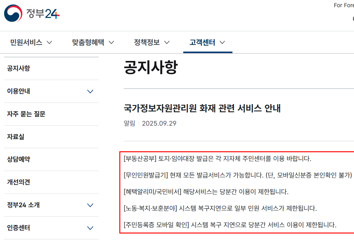 화재 직후 전국의 주민센터, 세무서, 우체국에서 민원 발급이 불가능했습니다. 주민등록등본, 인감증명서, 가족관계증명서 등 기본 행정 서비스가 멈췄고, 금융 거래나 통계 처리에도 차질이 발생했습니다.